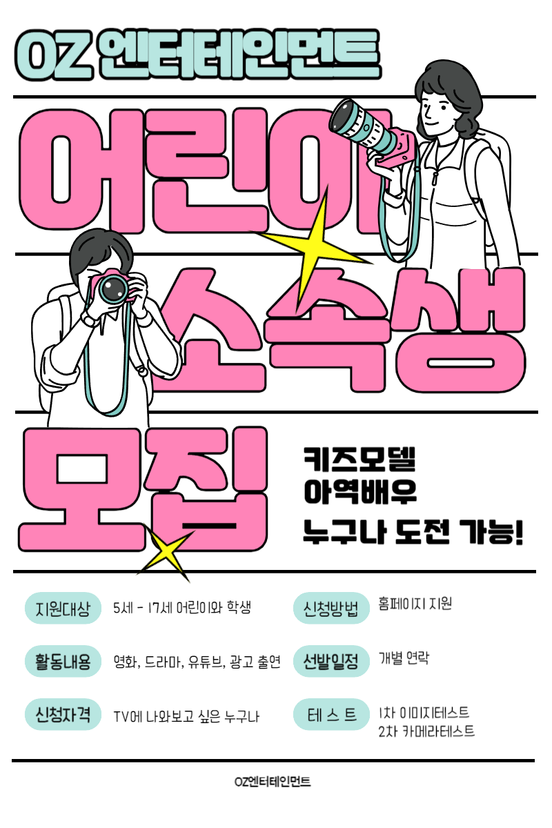 어린이나 청소년들이 연기자의 꿈을 꾸고 있다면, 오즈엔터테인먼트의 소식을 눈여겨볼 만해요. 5세부터 17세까지의 폭넓은 연령대를 대상으로, 방송과 뉴미디어 분야에서 활동할 신인 배우들을 찾고 있다고 해요.